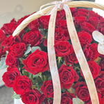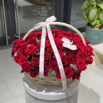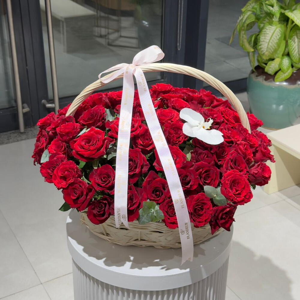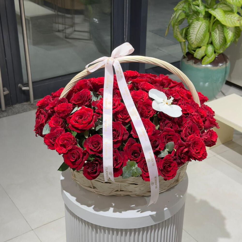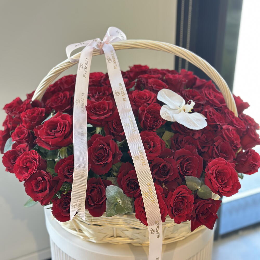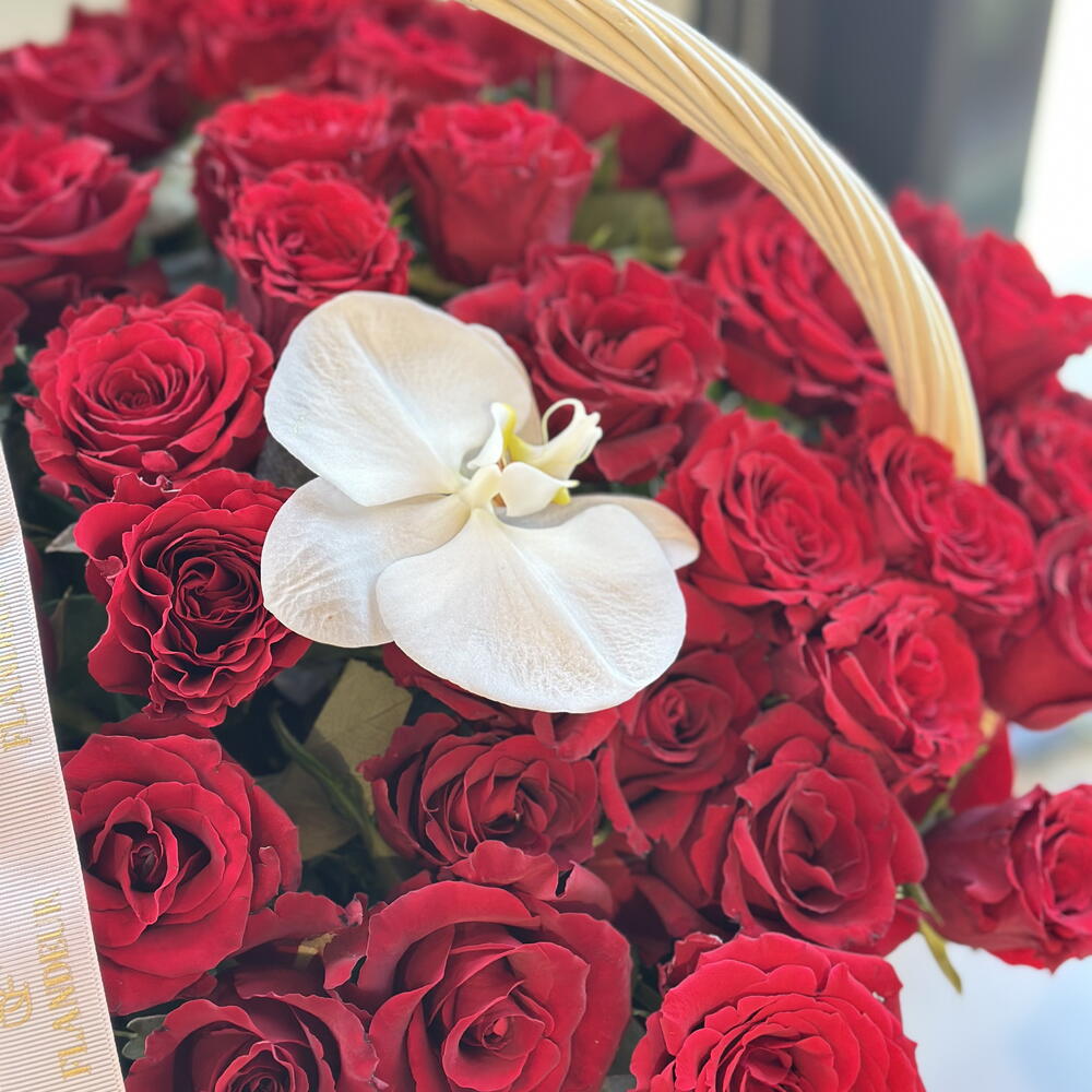 Red rose - 85 pcs Basket - 1 pcs cut white orchid flowers - 1 pcs