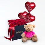 Combo of 25 red roses box in black box, teddy bear of 25 cm and 3 pieces heart shaped foil balloons filled with helium