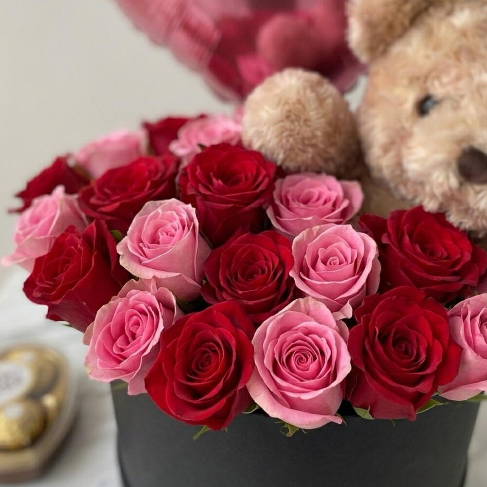 Red rose - 10 pcs Pink rose - 10 pcs Teddy bear - 1 pcs chocolate box - 1 pcs red heart helium balloons - 1 pcs