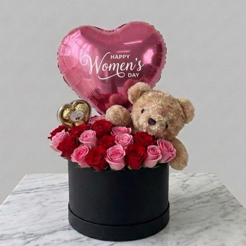A complete womens Day gift set featuring a 10 red rose bouquet, pink rose ,chocolates in a heart-shaped box, a red heart helium balloon, and a cute teddy packed in a gift bag. This thoughtfully curated combo is perfect for Valentine’s surprises, romantic gestures, anniversaries, and special moments. A sweet mix of flowers, treats, and keepsakes designed to make her smile and feel loved.