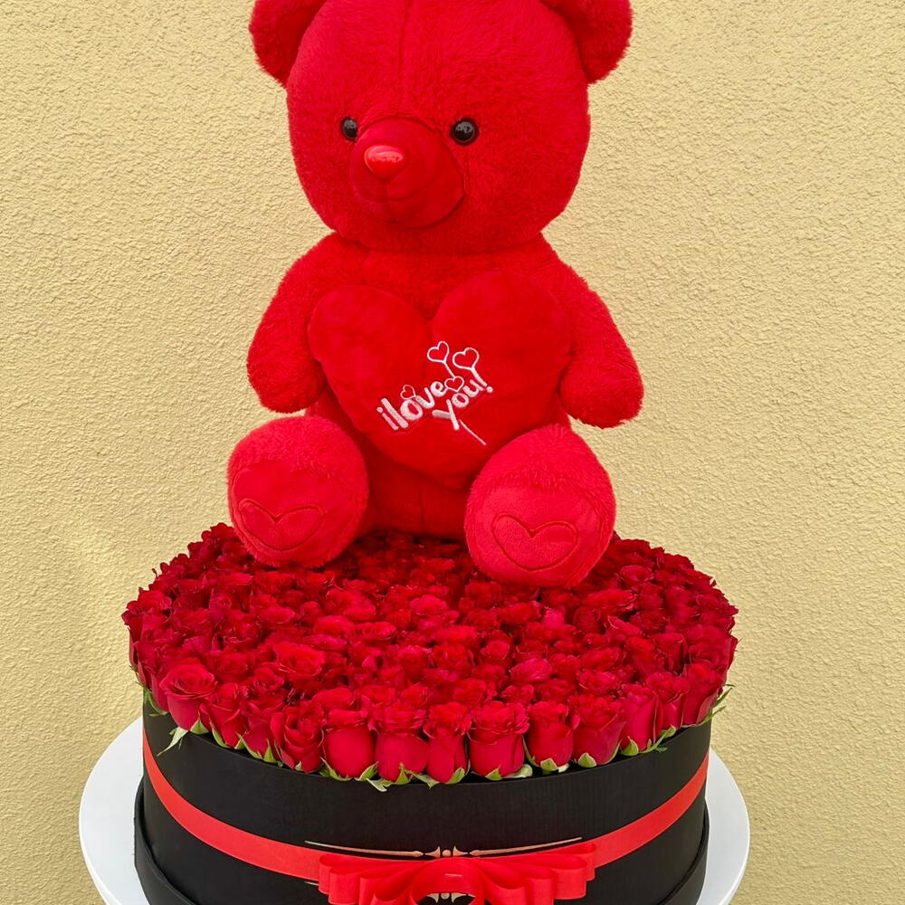 Indulge in the delicate beauty of this exquisite Flower Box, featuring 200 long-stemmed Red Roses, exuding passion and romance. To add a touch of allure, the arrangement is complemented by a charming Teddy Bear radiating warmth and coziness. Enhancing the celebratory spirit are two heart-shaped balloons, spreading love in its purest form. This spectacular flower ensemble promises to transform your moments into cherished memories. Perfect for anniversaries, romantic surprises, or expressing heartfelt emotions.