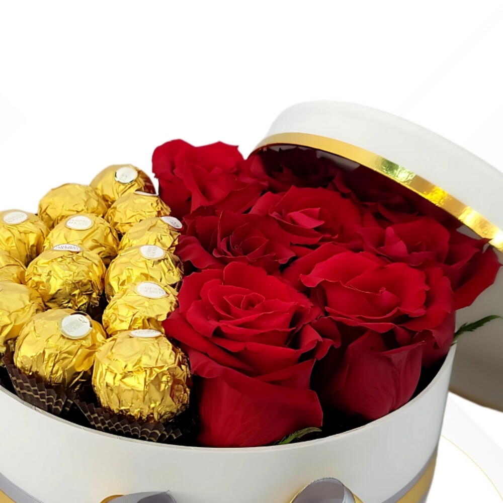 A luxurious white box featuring beautifully arranged red roses alongside Ferrero Rocher chocolates, offering a gift that combines elegance and delicious taste.