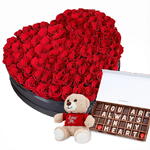 You Are Always In My Heart Chocolates, I Love You Teddy 25cm, 121-151 Red Roses, Arranged in a XXL Black Heart Shape Box, Tied with Black Ribbon Bow.