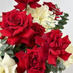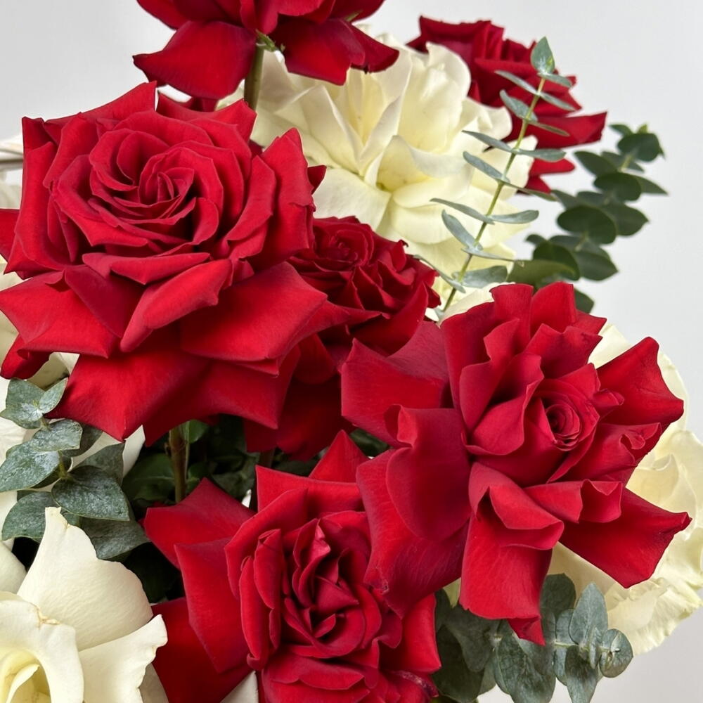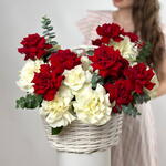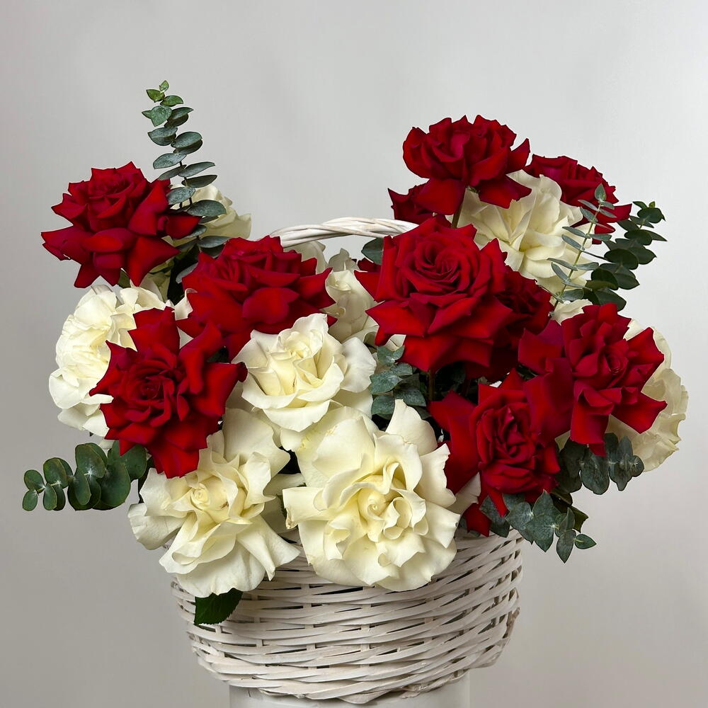 Basket - 1 pcs eucalyptus leaves - 10 pcs white classic roses - 25 pcs red classic roses - 26 pcs