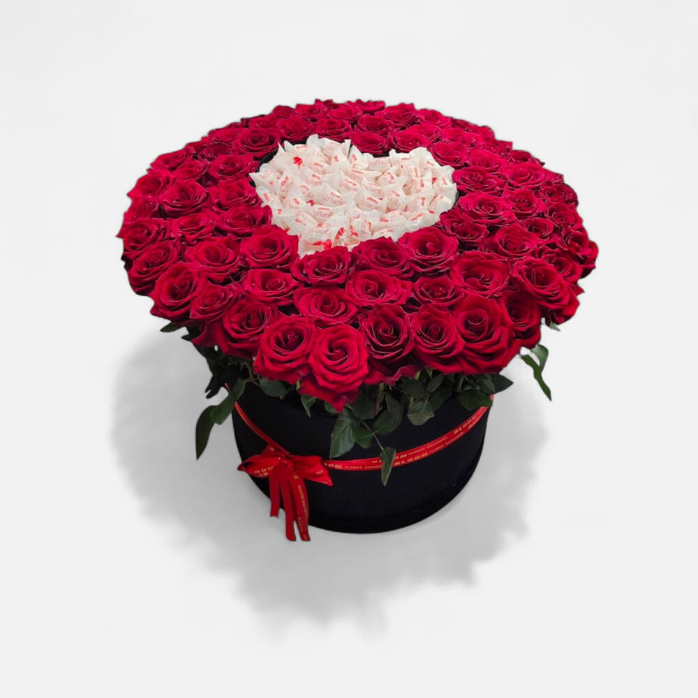 Red rose - 99 pcs Raffaello - 20 pcs black box - 1 pcs red heart helium balloons - 5 pcs