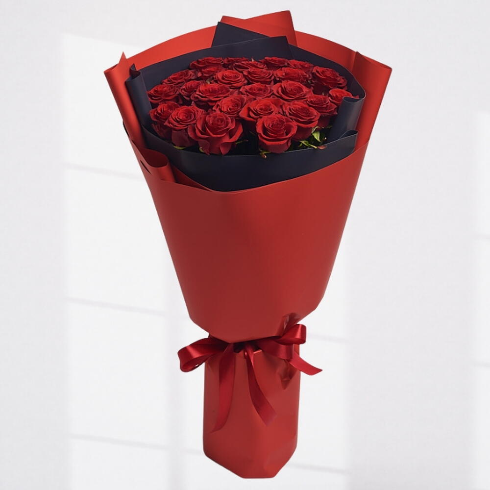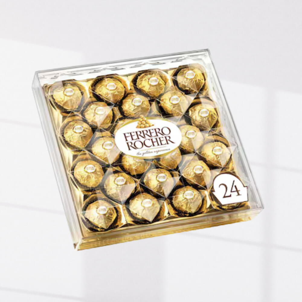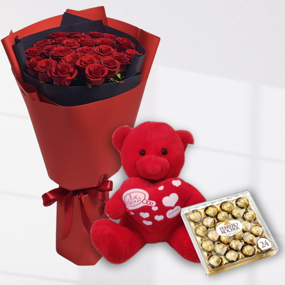 Luxurious Red Roses, Teddy Bear Ferrero Rocher Chocolates A stunning bouquet of 25 red roses with a plush teddy bear and 24 pieces of Ferrero Rocher chocolates, beautifully wrapped for the perfect romantic gift