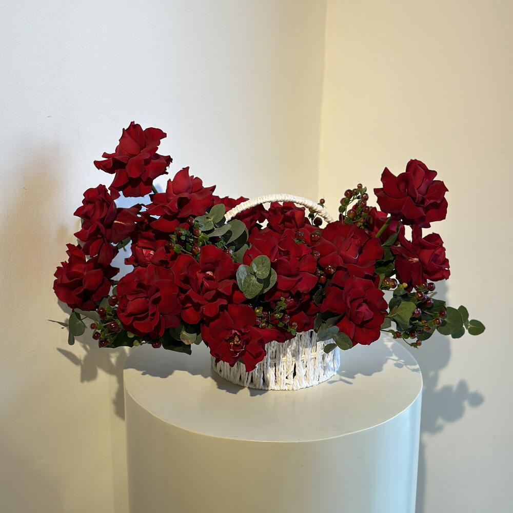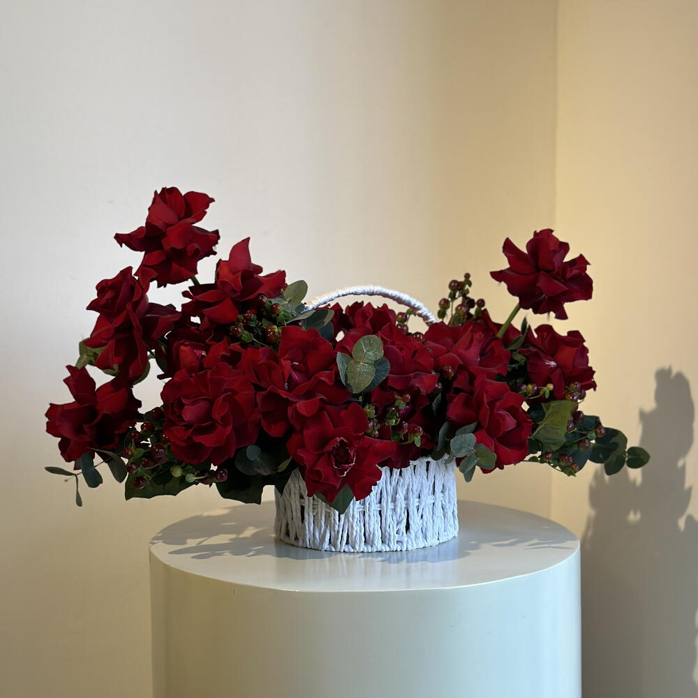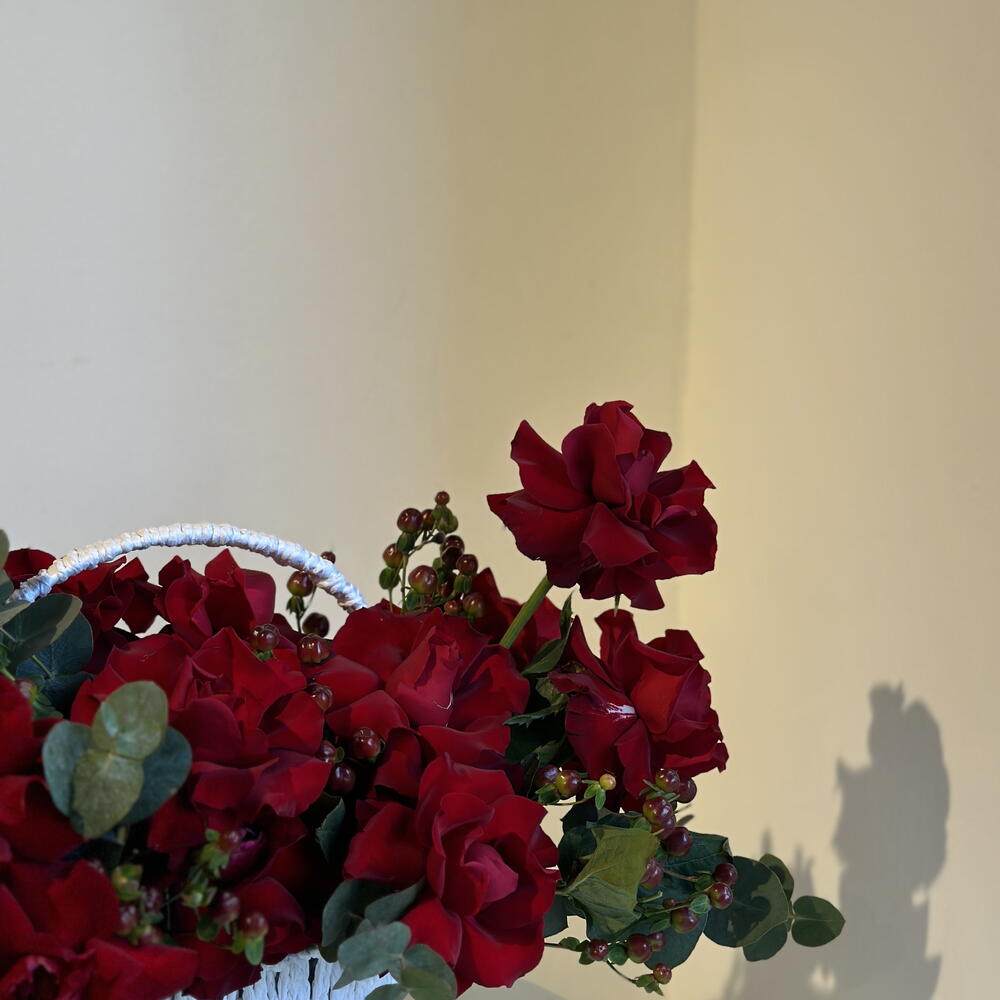 Red rose - 20 pcs Eucalyptus - 8 pcs Basket - 1 pcs hypericum - 5 pcs