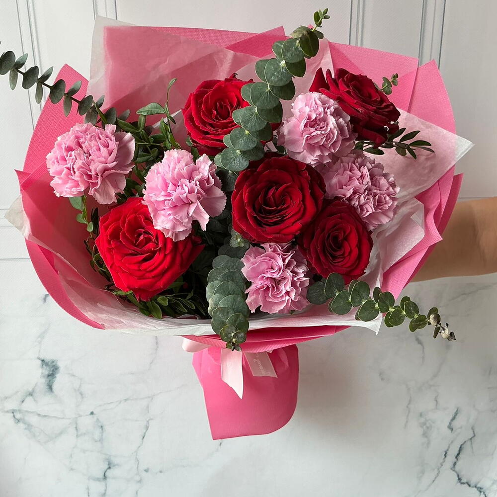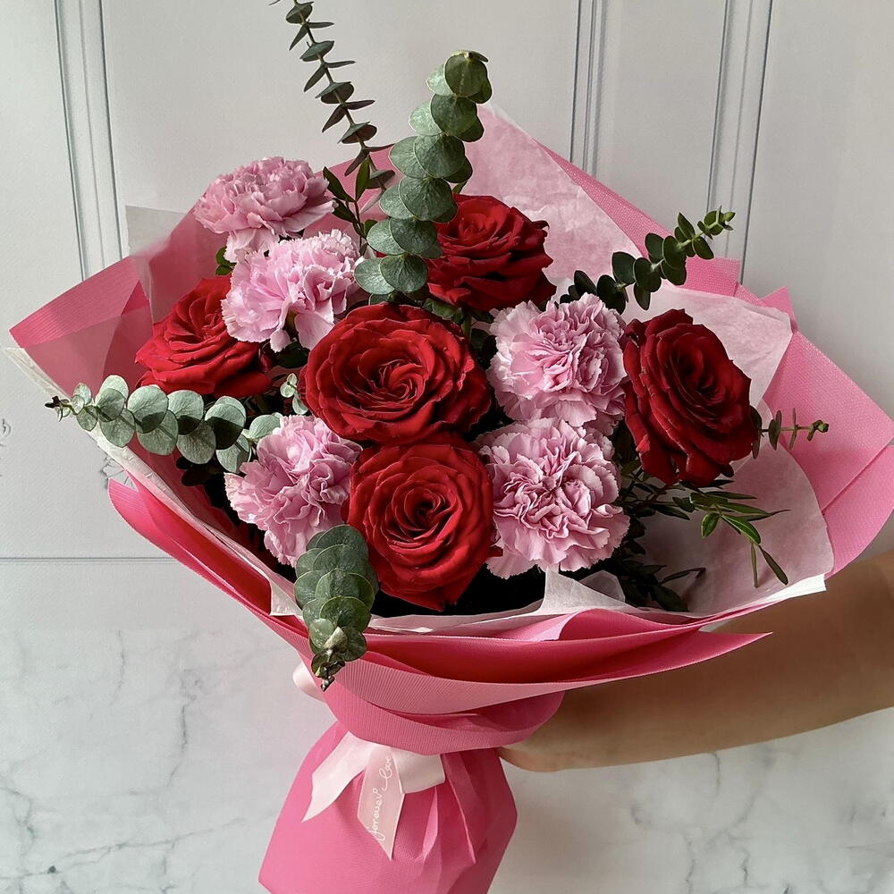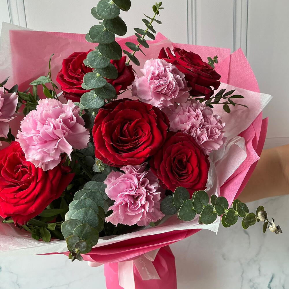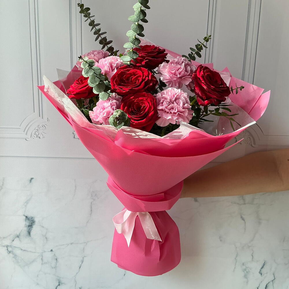 Pistachio - 1 pcs pink carnations - 5 pcs eucalyptus cineria - 1 pcs red premium kenyan roses - 5 pcs