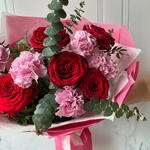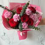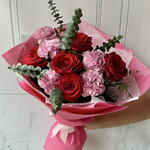 Immerse yourself in the elegance of our Florists Special arrangement. Crafted with an exclusive selection of 1 radiant Pistachio, 5 romantic pink carnations, a touch of 1 stately eucalyptus cineria, and the finishing grace of 5 premium Kenyan red roses. This charming composition is sure to enchant with its bewitching allure and intricate design. Ideal to adorn any space or as a heartfelt gift. Impeccably designed to showcase the exquisite beauty of each stem.