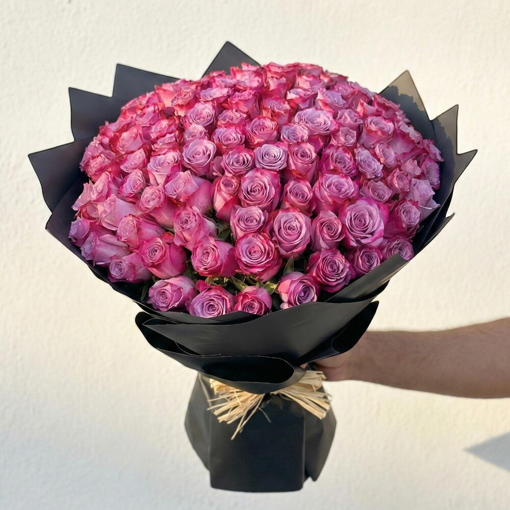 The Velvet Bloom bouquet is a royal masterpiece of floral design, featuring 101 deep purple roses that exude sophistication, passion, and elegance. With their rich, velvety petals and captivating hue, these roses make an unforgettable gift for grand romantic gestures, milestone celebrations, or luxurious décor. Presented in sleek black wrapping with refined accents, this bouquet is a statement of pure elegance and grandeur. Care Recommendations: To maintain the beauty of your Velvet Bloom bouquet, trim each stem at a 45-degree angle before placing them in a clean vase filled with fresh, cool water. Refresh the water every two days and remove any leaves below the waterline to prevent bacteria. Keep the bouquet away from direct sunlight, heating appliances, and cold drafts. A cool environment will help the roses stay vibrant and fresh for longer, preserving their deep, enchanting color.