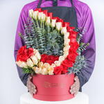 65 Roses Arrangement – 35 Red Roses,30 Peach Roses,3 stems of Eryngium,and 3 stems of Eucalyptus.