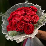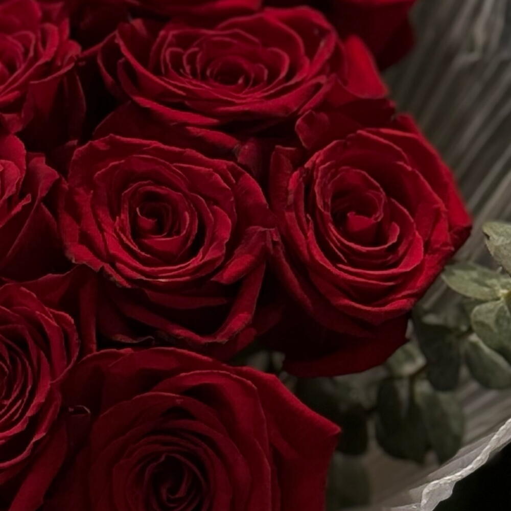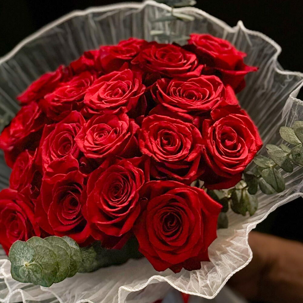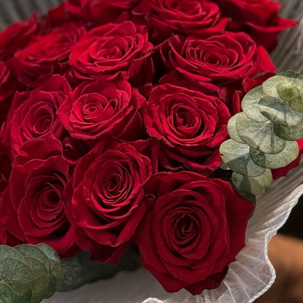 A timeless hand-tied arrangement featuring premium deep red roses, symbolizing love, passion, and elegance. Each rose is carefully selected for its rich color and full bloom, beautifully wrapped with textured white pleated paper and accented with fresh eucalyptus for a modern, luxurious touch. Perfect for romantic occasions, anniversaries, birthdays, or any moment you want to make unforgettable.