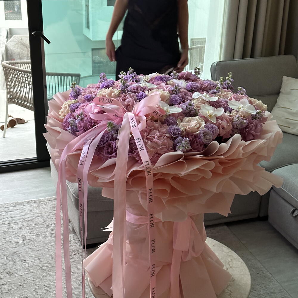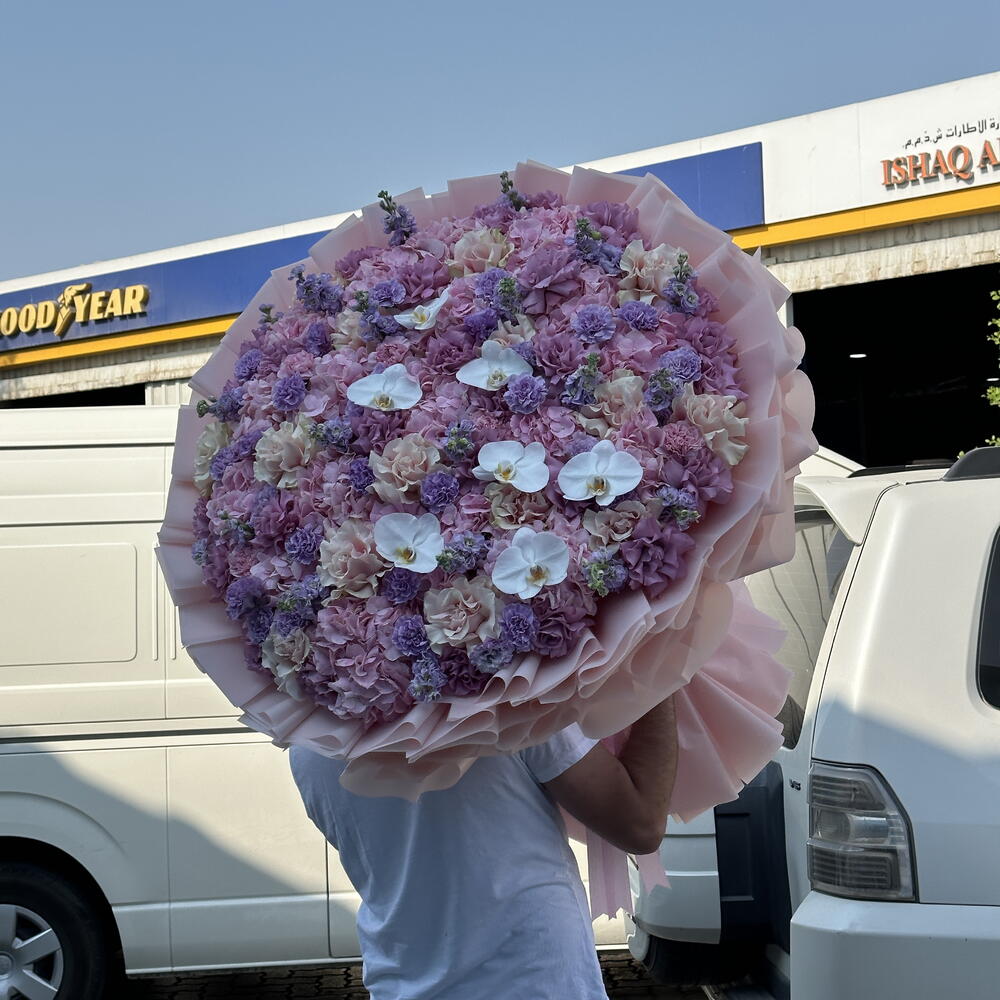 Eustoma - 20 pcs Hydrangea - 30 pcs Orchid - 8 pcs rose - 70 pcs carnation - 30 pcs
