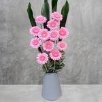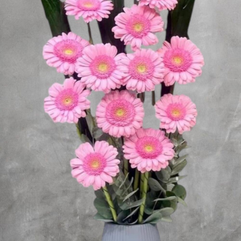 eucalyptus leaves - 3 pcs pink gerbera daisies - 15 pcs green larg leaf - 3 pcs cremic vase - 1 pcs