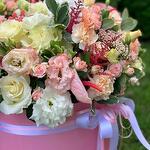 Composition: Anthurium - 5, Hydrangea - 3, Astilbe - 5, Rose Mondial - 15, Dianthus - 11, Ozothamnus - 3, Lisianthus - 10, Rose sprey Madame Bombastic - 10, Hypericum - 3, Pittosporum - 8, box - 1, ribbon - 2 Sizes: WIDTH - 50CM; HEIGHT - 50CM; LENGTH - 50CM; (including packaging) Size: 50 x 50 x 50 cm