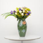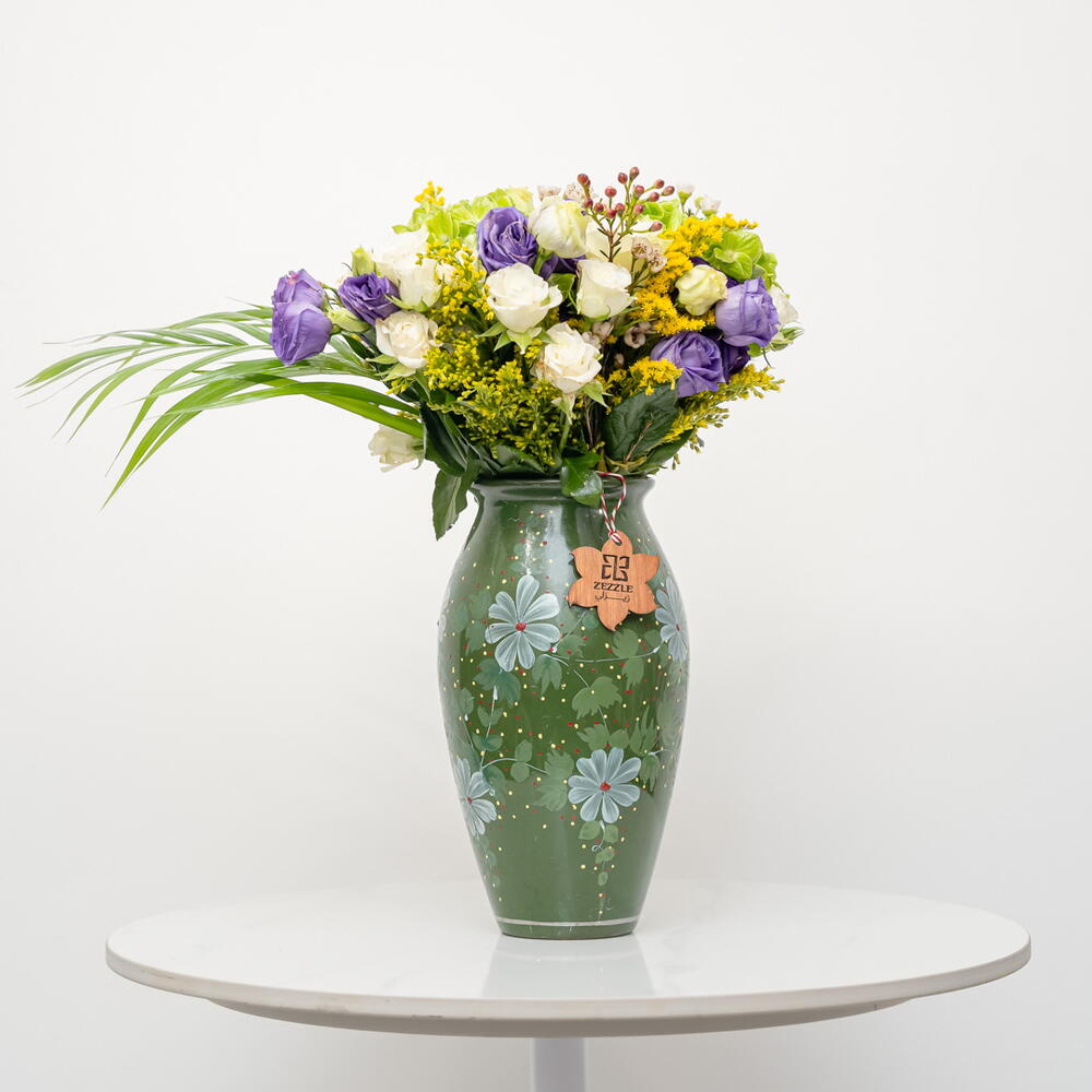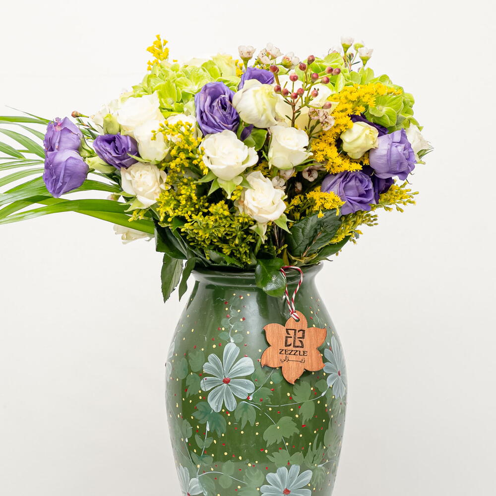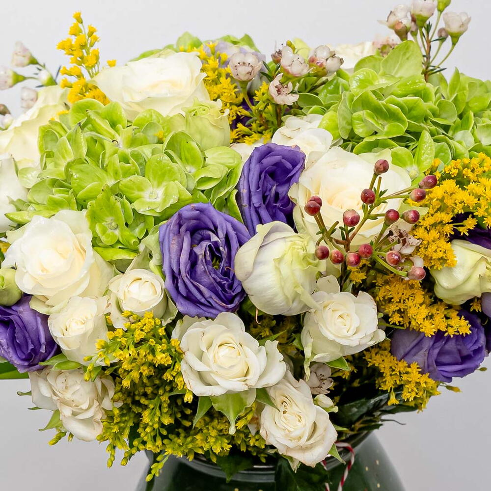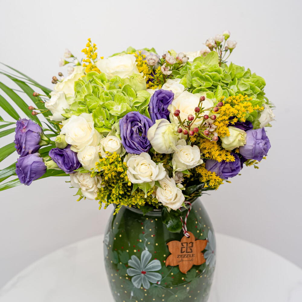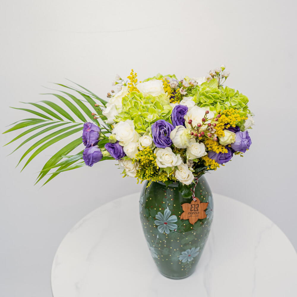 Verdant Harmony: A Symphony of Tranquil Greens A verdant and harmonious bouquet, Verdant Harmony features 3 majestic green hydrangeas, 5 delicate purple eustoma, 7 pure white roses, and 5 golden solidago stems, beautifully arranged in a ceramic vase. This lush arrangement exudes tranquility and sophistication. The combination of the lush green hydrangeas, the soft purple eustoma, the classic white roses, and the bright solidago, creates a stunning and calming display. Embrace the Calm of Natures Palette