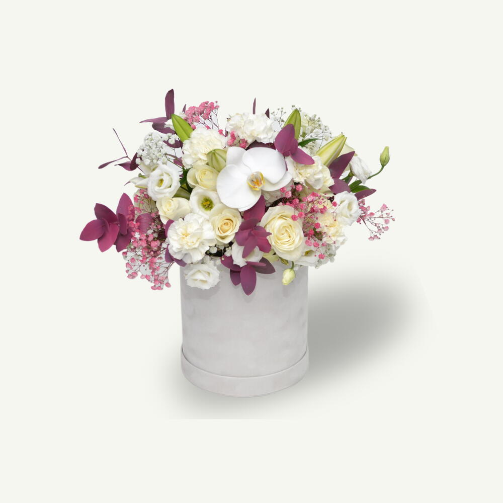 A mixture of 10 white roses, 10 white carnations, 2 white lilies stems, 5 white lisianthus stems, 1 white orchid stem, purple eucalyptus, and purple and white gypsophila gently crafted in a white velvet box for a graceful and refined floral arrangement.