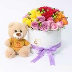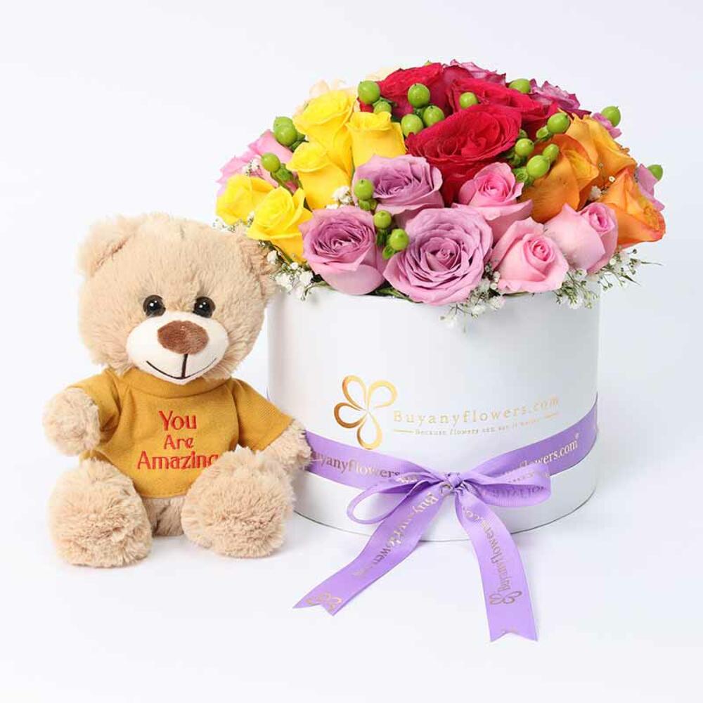 Product Details: You Are Amazing Teddy Bear 20cm, 21 Mix Color Roses, 4 Stems Green Hypericum, 1 Gypsophila, Prepared in a Round White Box, Tied with a Ribbon Bow.