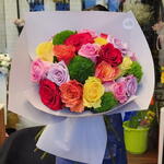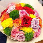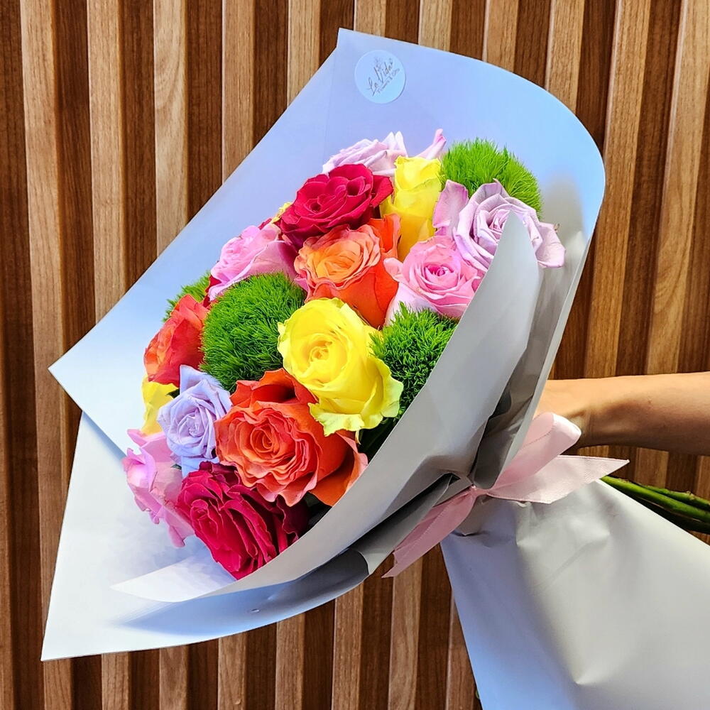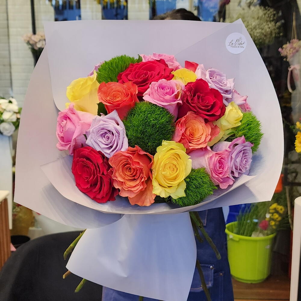 wrapping paper - 4 pcs fresh red roses - 3 pcs fresh yellow roses - 4 pcs green balls - 4 pcs fresh pink roses - 4 pcs fresh orange roses - 4 pcs fresh purple roses - 4 pcs