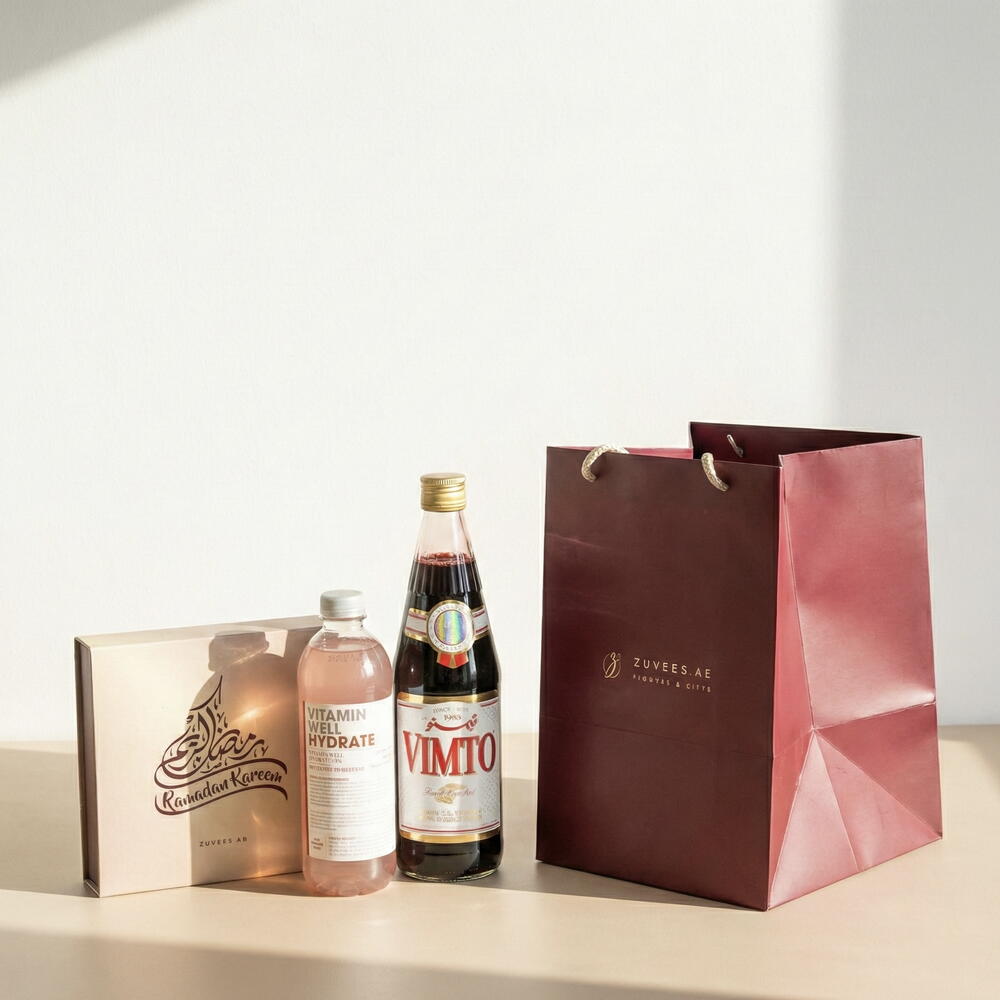 Celebrate the spirit of Ramadan with the Vimto Ramadan Iftar Combo, a compact and thoughtful gift set designed for refreshing Iftar moments and easy distribution. Featuring the iconic Vimto drink, a premium ZUVEES Dates Baklava box, and Vitamin Well Hydrate, this set blends tradition, sweetness, and modern hydration in one elegant Ramadan presentation. Perfect for corporate Ramadan gifting, mosque gatherings, staff appreciation, and mini Iftar treats, this combo delivers a balanced experience — from the nostalgic taste of Vimto to nourishing hydration and indulgent sweets. Presented in a Ramadan Kareem themed box, it offers a festive touch that makes every gesture feel meaningful and complete.