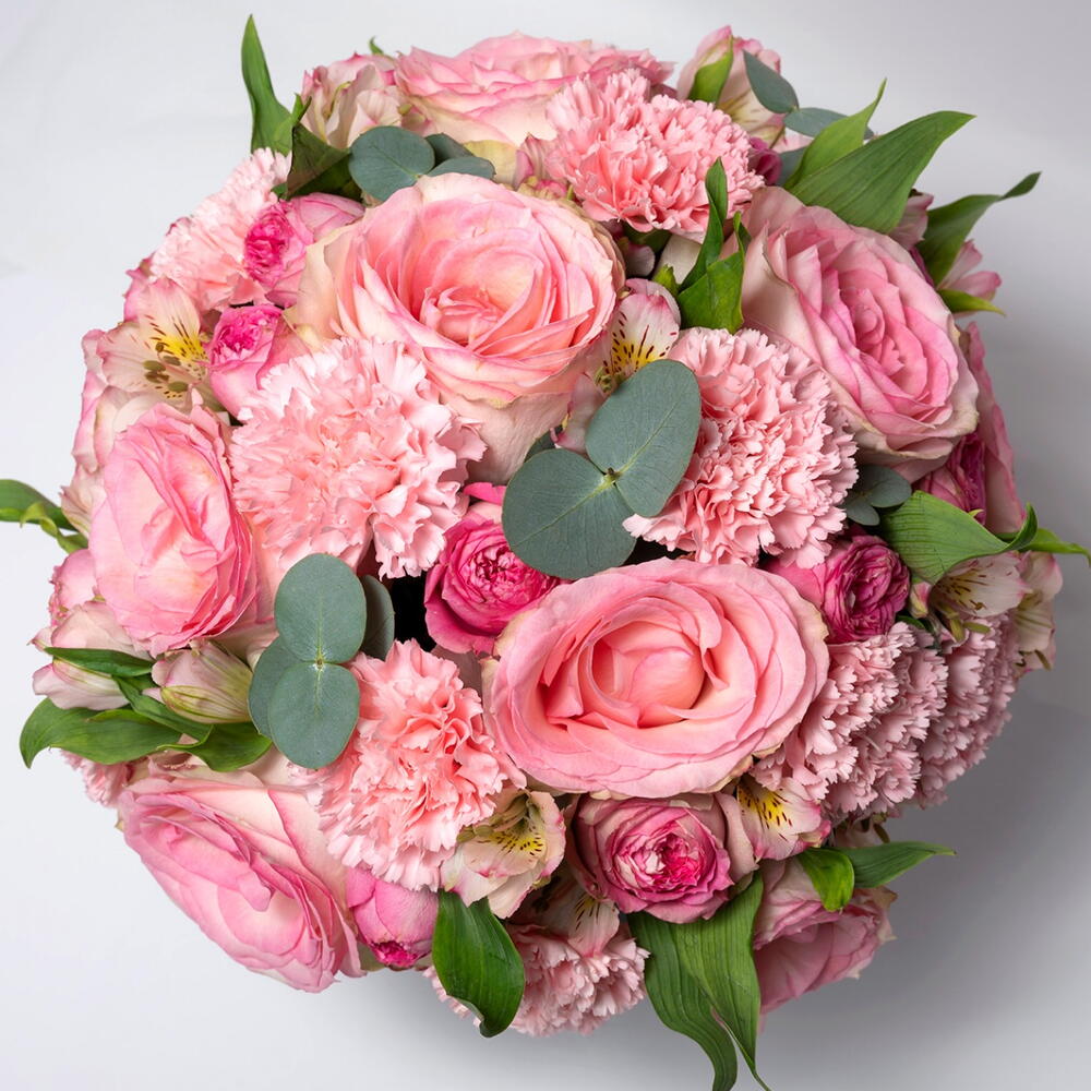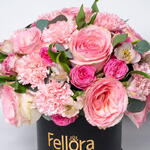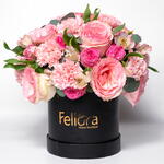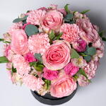 Peony rose - 5 pcs Pink rose - 10 pcs Black round box - 1 pcs carnation pink - 10 pcs alstroemerias - 5 pcs eucalyptus leaves - 2 pcs