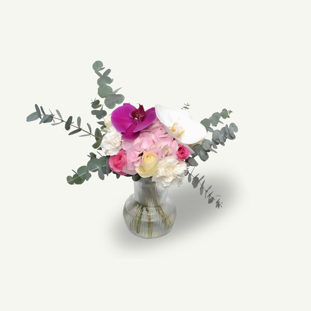 A mixture of 5 white and pink roses, 3 white carnations, 1 pink hydrangea, purple and white orchids, and eucalyptus gently crafted in a clear 17 cm vase for a soft and elegant arrangement. Please note that the vase and the flower arrangement will be packed separately.