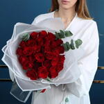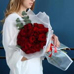 Flower types: Red roses and Eucalyptus. Packaging: White Wrapper. Care instructions: Change the water daily, preferably placed in a cool place.