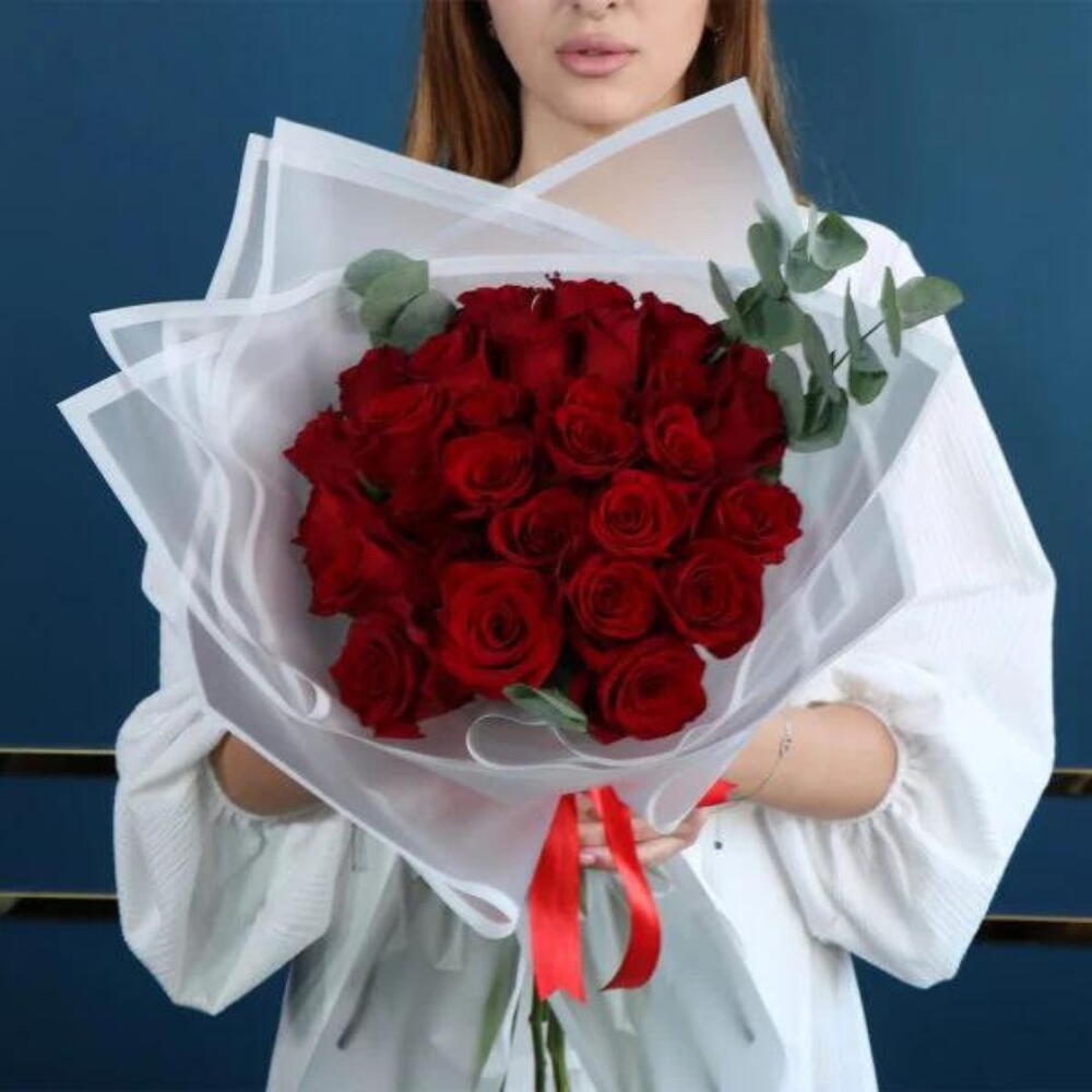 Flower types: Red roses and Eucalyptus. Packaging: White Wrapper. Care instructions: Change the water daily, preferably placed in a cool place.