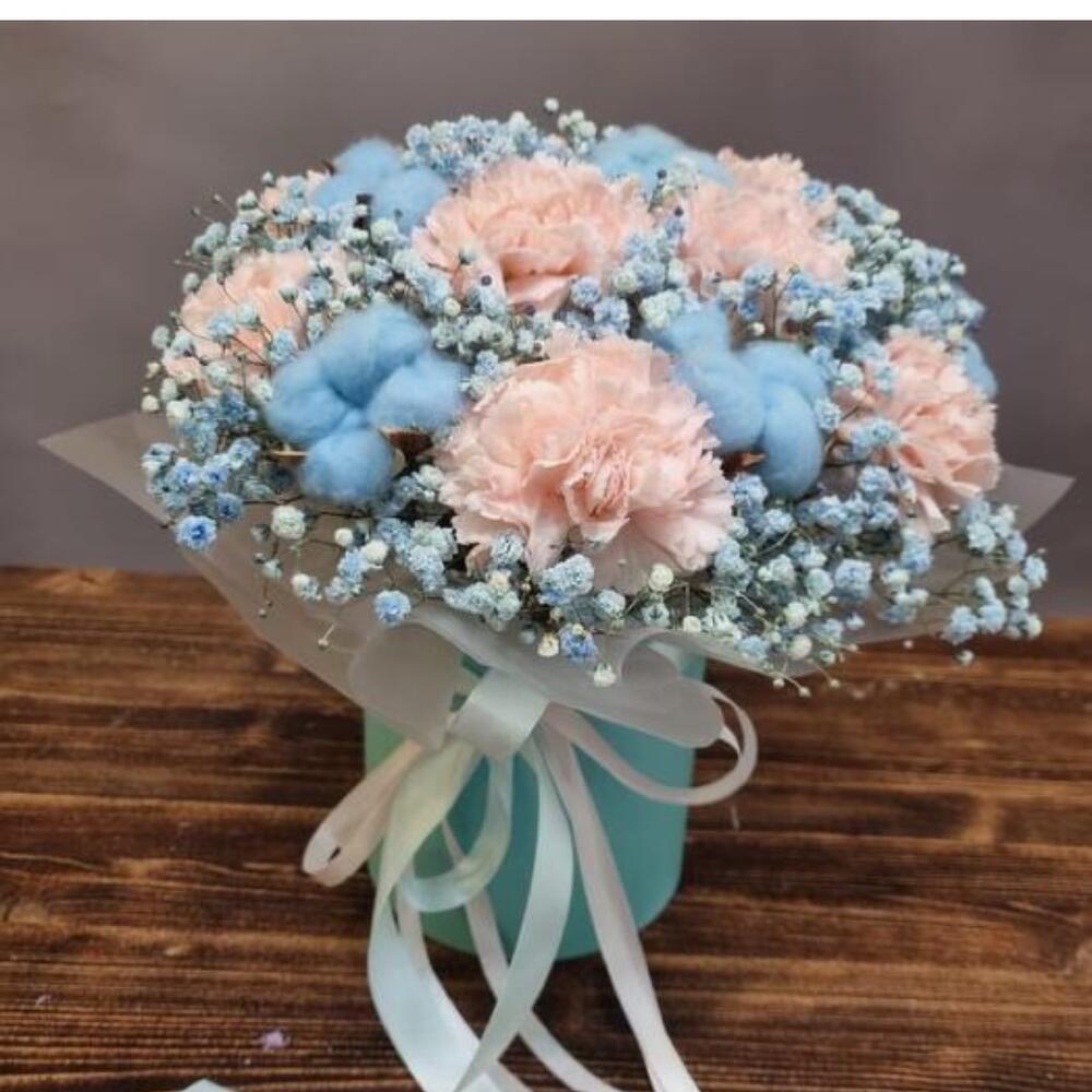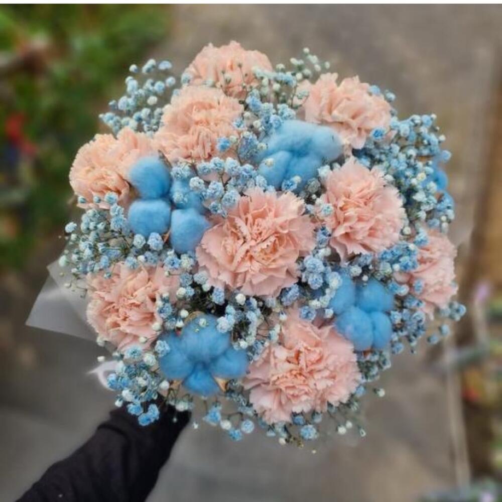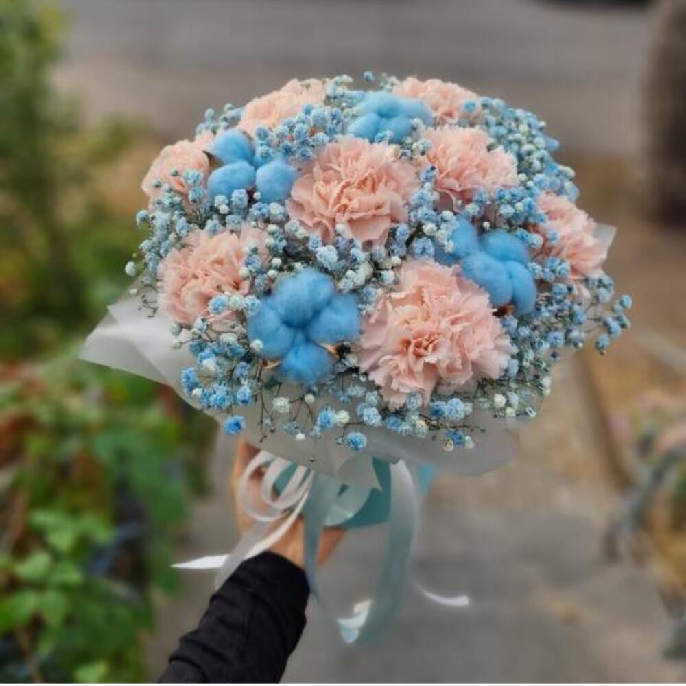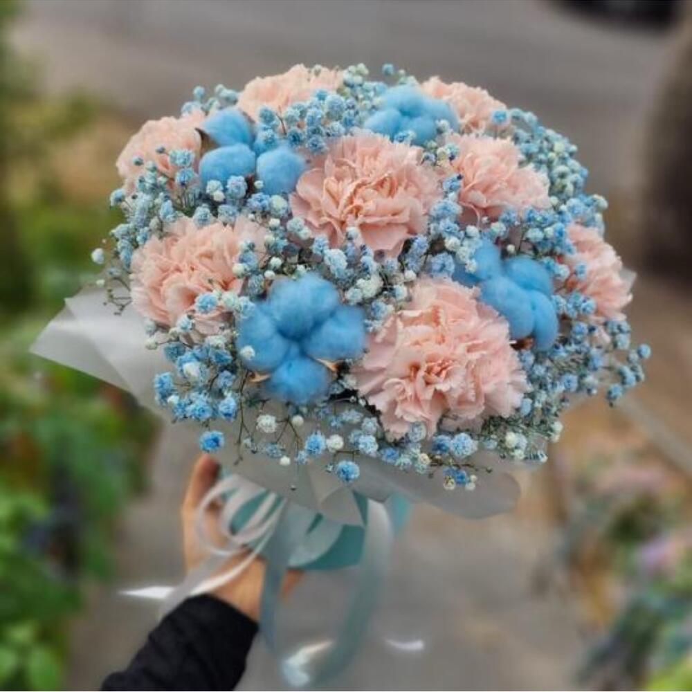 pink carnation - 9 pcs gypsophila blue - 4 pcs blue cotton try flower - 4 pcs
