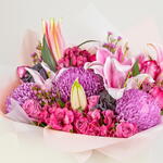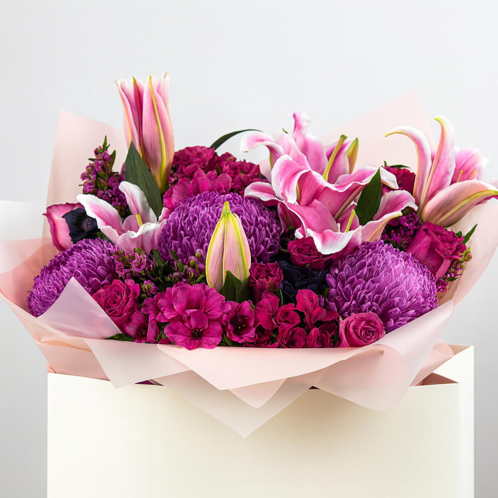 Immerse yourself in the enchanting beauty of Violet Whisper, Floriva’s luxurious floral creation designed to express elegance, depth, and romance. This premium arrangement blends vibrant purple chrysanthemums, delicate pink lilies, rich magenta blooms, and lush seasonal accents, all harmonized to showcase the captivating charm that defines Violet Whisper. Expertly crafted by Floriva’s floral designers, Violet Whisper offers a striking combination of texture, color, and movement—making it a perfect choice for gifting, celebrations, or elevating any special moment. With its artistic composition and premium flower selection, Violet Whisper embodies Floriva’s signature blend of beauty, sophistication, and modern floral design.