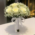 A delicate and romantic bouquet composed entirely in snow-white tones, perfect for weddings, anniversaries, or to simply brighten someone’s day. The combination of soft white roses, airy baby’s breath, and gentle greenery creates a graceful and serene composition. This bouquet speaks of purity, elegance, and timeless beauty. Wrapped in a classic style, it fits both formal and intimate occasions. Keep it in a cool spot to preserve its freshness. Change the water every two days and trim the stems slightly at an angle to help the flowers absorb water better. Avoid direct sunlight and heating devices to prolong the bouquets life.