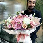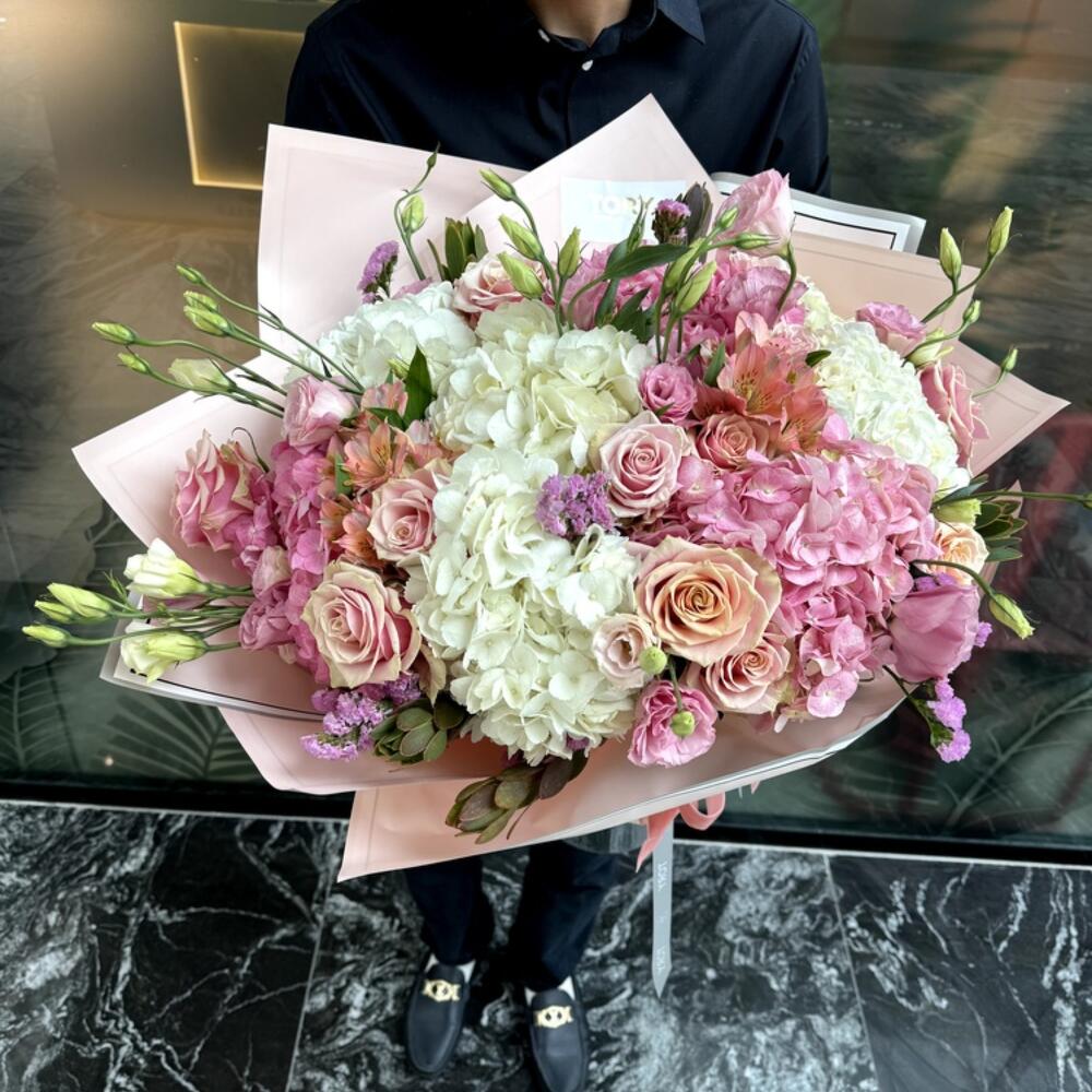 Hydrangea - 9 pcs Alstroemeria - 2 pcs Lisianthus - 12 pcs statica import - 5 pcs flower wrapping paper - 1 pcs rose caramel - 13 pcs leucadendron mix - 5 pcs