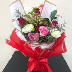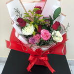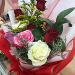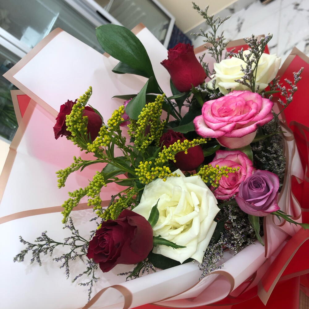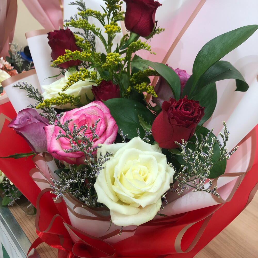 Immerse in the poetic harmony of our florists special bouquet, artfully arranged with four captivating red roses that symbolize love respect. Offset by five delicate pieces of Limonium, famed for their charming sea lavender presence and mingled with two pristine white roses, the epitome of purity and innocence, the scene is truly enchanting. The bouquet is further enhanced by two dreamy purple roses, embodying enchantment and deep magnetism. It is balanced with the refreshing green tone of a single ruscus, a symbol of humility and the undeniable vibrancy of two gumila roses. This wonderful arrangement is more than mere flowers; its an emotion, a distinctive way to articulate your sentiments. Perfect for those, who appreciate not just the aesthetics, but also the language of flowers.