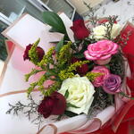 Red rose - 4 pcs Limonium - 5 pcs White rose - 2 pcs purple rose - 2 pcs single ruscus - 1 pcs gumila roses - 2 pcs