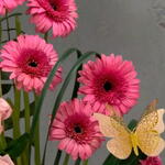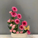 Gerbera Daisies: These are the large, vibrant pink flowers with a dark center. Gerbera daisies are known for their big, bold blooms and are a popular choice in bouquets. Roses: The smaller, clustered pink flowers are roses. They are arranged around the base and sides of the Gerbera daisies, adding texture and a different shape to the arrangement. The floral arrangement is a symmetrical front-facing design, often used for special occasions. It is presented in a white ceramic container and includes a decorative butterfly and various green leaves.