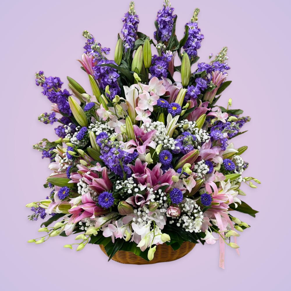 purple lisianthus - 7 pcs pink lily - 4 pcs pink orchid - 5 pcs purple statics - 5 pcs