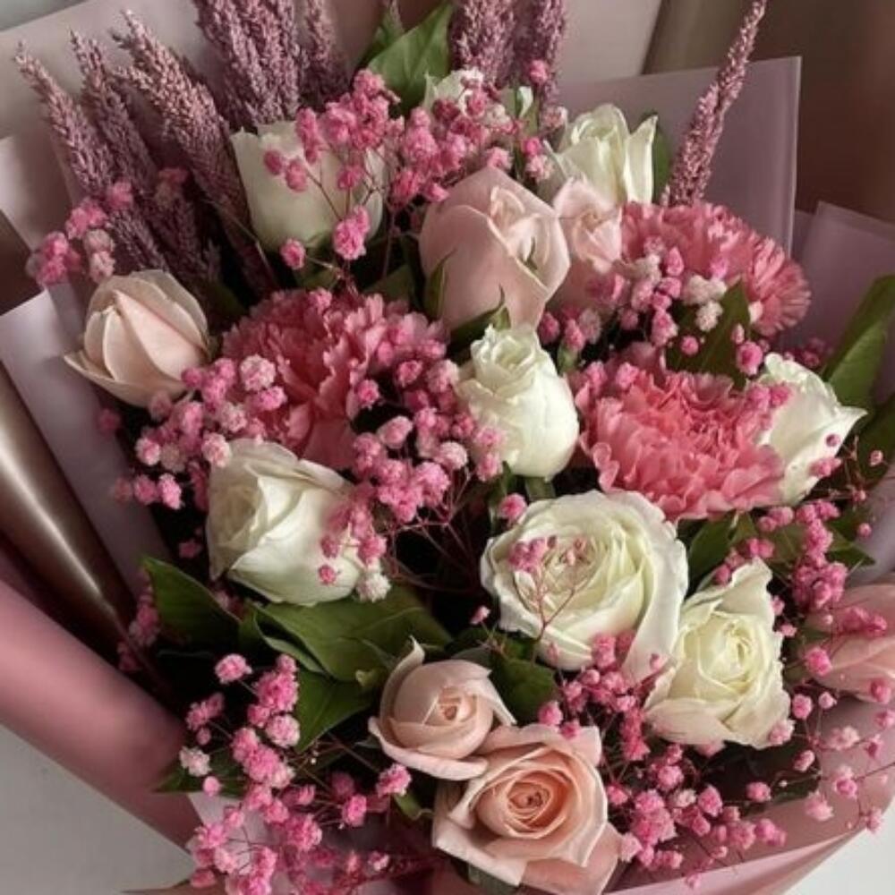 A dreamy arrangement of white and soft pink roses, pink blooms, and delicate fillers, wrapped in elegant blush tones. Perfect for expressing love, grace, and gentle affection.