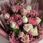 gypsophila pink - 10 pcs pink chrysanthemum - 3 pcs pink astilbe - 15 pcs white roses - 8 pcs pech pink roses - 7 pcs
