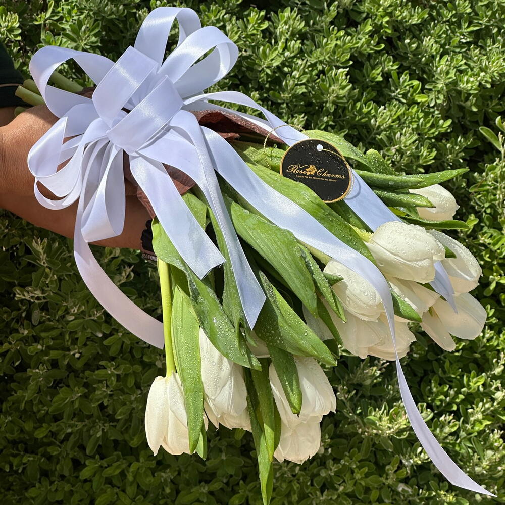 A bouquet of 21 white tulips exudes elegance and simplicity, symbolizing purity, peace, and new beginnings. These fresh, pristine blooms arranged together create a stunning visual display, perfect for conveying heartfelt emotions and adding a touch of sophistication to any occasion.