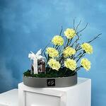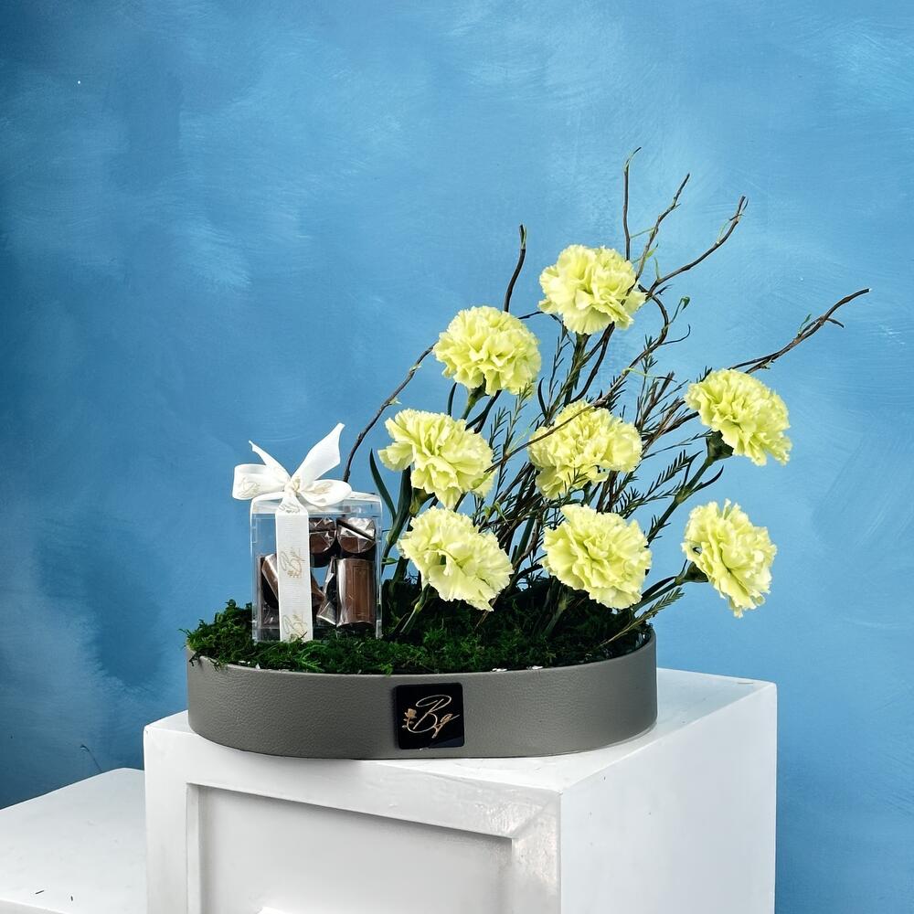 Immerse yourself in an experience of sheer elegance and delight with our Flowers in a Box product. Carefully selected and beautifully arranged, this gift set features a symphony of 8 sublime carnations, complemented by 2 graceful salix. Hidden among the blooms, discover a sweet surprise - 16 Belgium chocolates that tantalize your taste buds with their rich, luxurious flavor. All these are tastefully presented in a sleek leather tray for a touch of sophistication. A perfect blend of natural beauty and indulgent treats, our Flowers in a Box is truly a treasure trove of happiness in a box!
