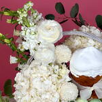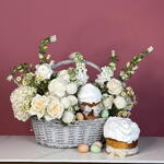 Eucalyptus - 5 pcs ranunculus white - 4 pcs egg - 4 pcs hydrangea white - 4 pcs tanacetum - 5 pcs matthiola white - 4 pcs ohara white - 7 pcs white basket m - 1 pcs easter bread m 450 gr - 1 pcs campanula white - 4 pcs chrysanhtemum pingpong - 4 pcs