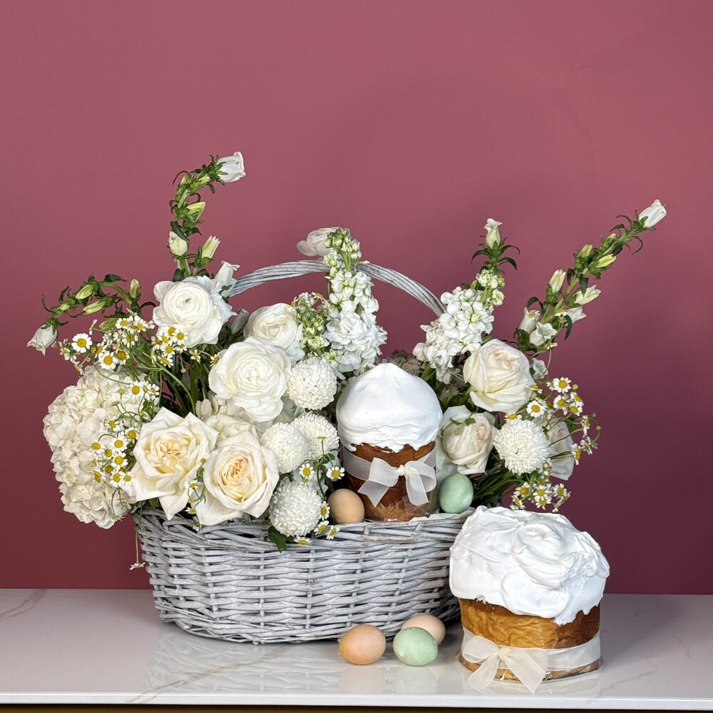 Eucalyptus - 5 pcs ranunculus white - 4 pcs egg - 4 pcs hydrangea white - 4 pcs tanacetum - 5 pcs matthiola white - 4 pcs ohara white - 7 pcs white basket m - 1 pcs easter bread m 450 gr - 1 pcs campanula white - 4 pcs chrysanhtemum pingpong - 4 pcs