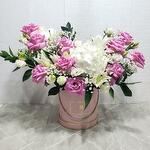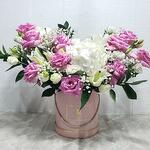 white lilly - 3 pcs white hydrangea - 1 pcs green filter - 4 pcs lisanthus - 4 pcs pink roses - 10 pcs