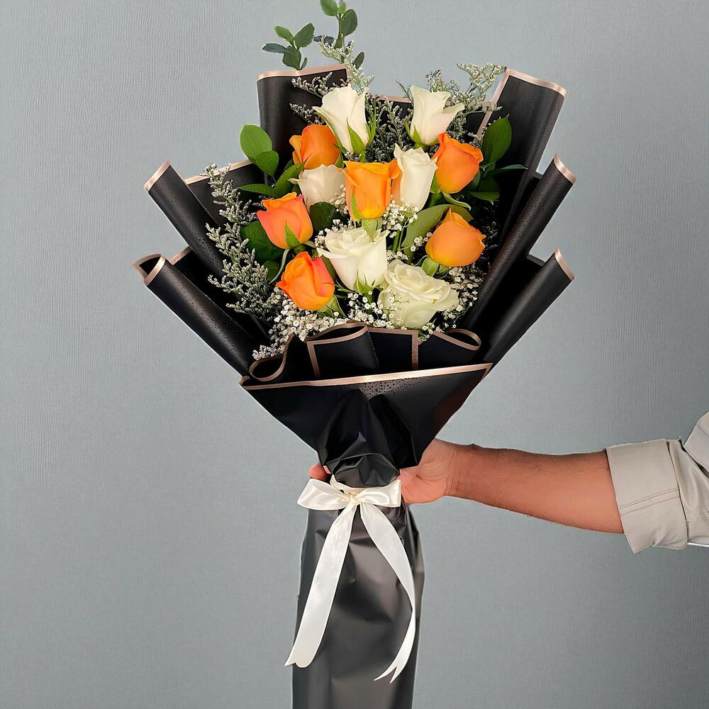 white roses 6pcs - 5 pcs orange roses in black warping with addon filler - 5 pcs