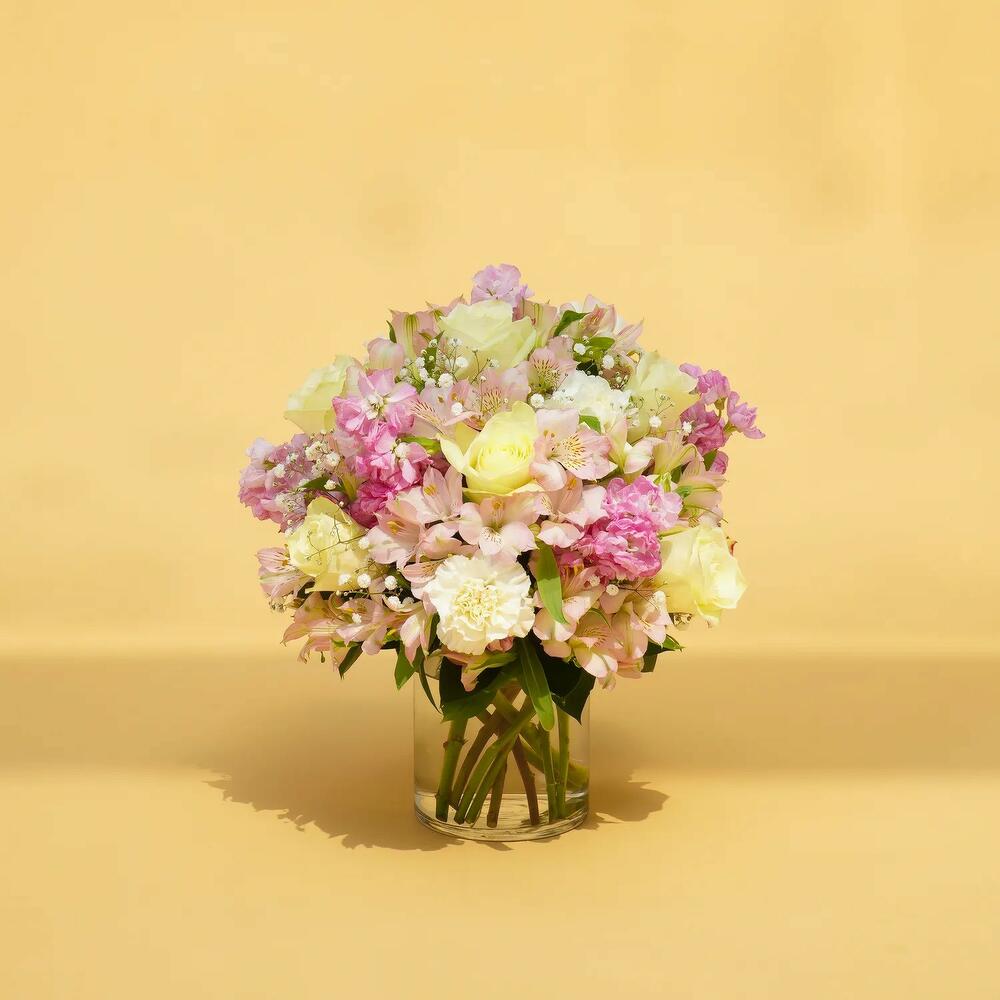 white carnations - 6 pcs pink alstroemeria - 10 pcs pink matthiola - 6 pcs stems single ruscus - 4 pcs round glass vase - 12x15cms - 1 pcs white roses - 10 pcs stems gypsophillia - 2 pcs stems eucalyptus - 2 pcs