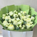 This stunning bouquet of white roses and spray roses is a true symbol of elegance and purity. The delicate combination of large and small blooms creates a voluminous and lush arrangement that suits any celebration or heartfelt gesture. Fresh greenery highlights the soft creamy-white tones, adding a touch of sophistication and freshness. Carefully wrapped in soft green paper, this bouquet is ready to impress at first sight. To prolong the beauty of the flowers, replace the water daily, cut the stems at a 45-degree angle, and keep the bouquet in a cool place away from direct sunlight. Ideal for those special moments like birthdays, anniversaries, or any heartfelt occasion, this flower bouquet transcends the ordinary and becomes a tangible manifestation of love. Send it as a birthday gift, express anniversary wishes, convey get well soon sentiments, or simply wish a loving moment to someone dear.