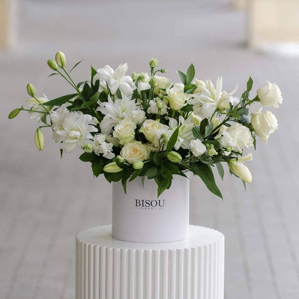 Box arrangement of 5stems of white lilies 10 stems of white roses and 5 stems of white lisianthus in a white box