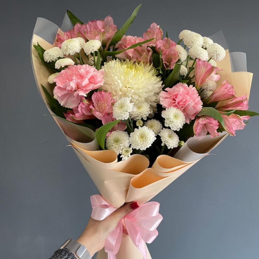 pink carnations - 2 pcs pink alstroemeria - 4 pcs white wrapping - 3 pcs white daco - 1 pcs chandini white - 3 pcs