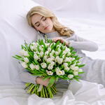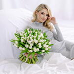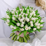 White Elegance is a refined and sophisticated bouquet that celebrates purity, grace, and timeless beauty. This luxurious arrangement features pristine white tulips carefully gathered into a full, rounded composition. Fresh green tulip leaves add natural texture and contrast, while delicate pussy willow branches bring a soft, organic accent.