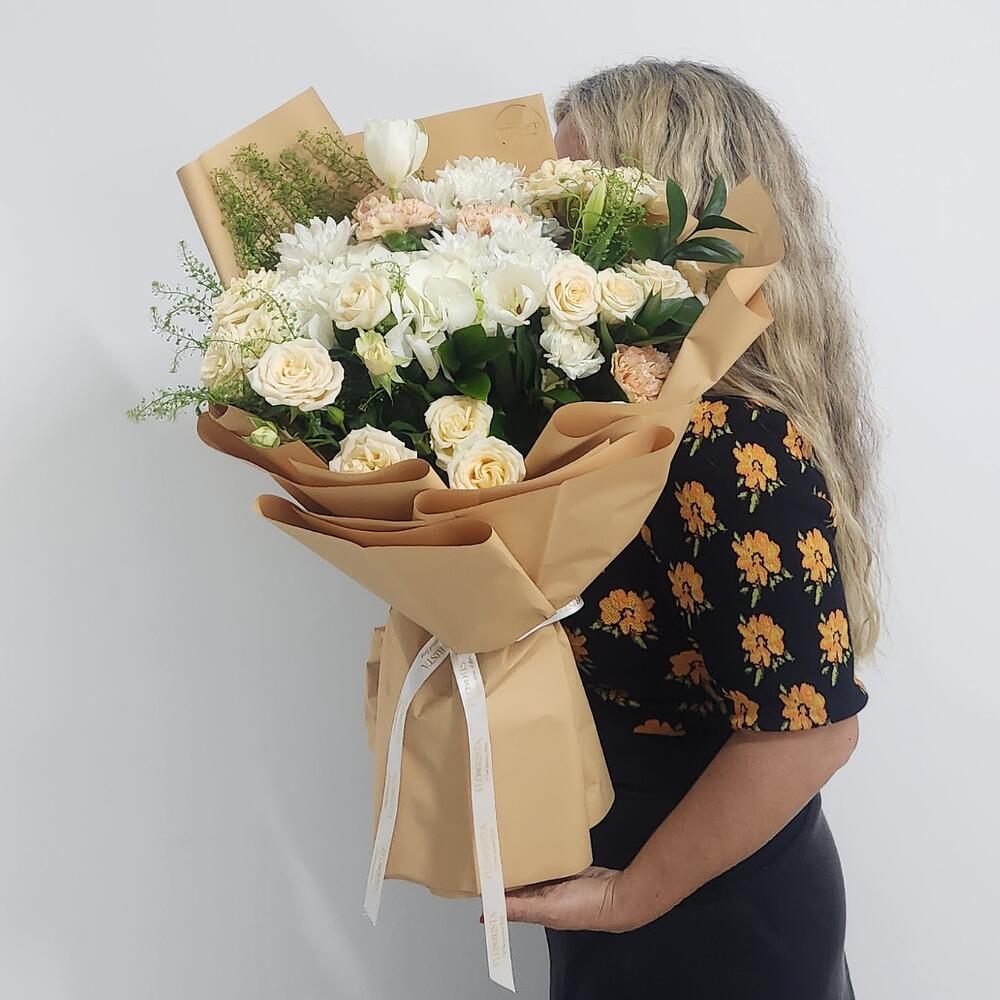 Spray rose - 5 pcs White rose - 10 pcs Chrysanthemum white - 5 pcs carnation - 5 pcs fillers - 5 pcs
